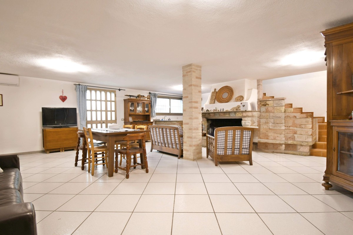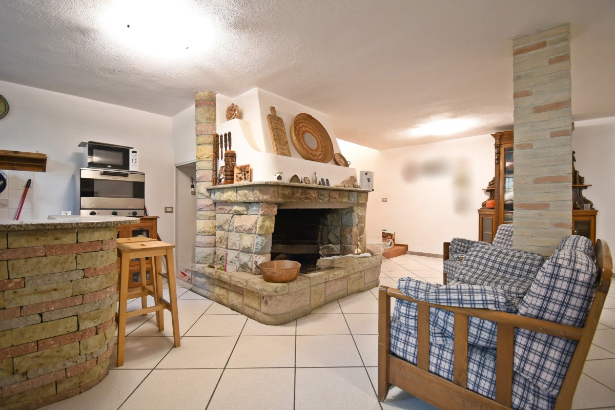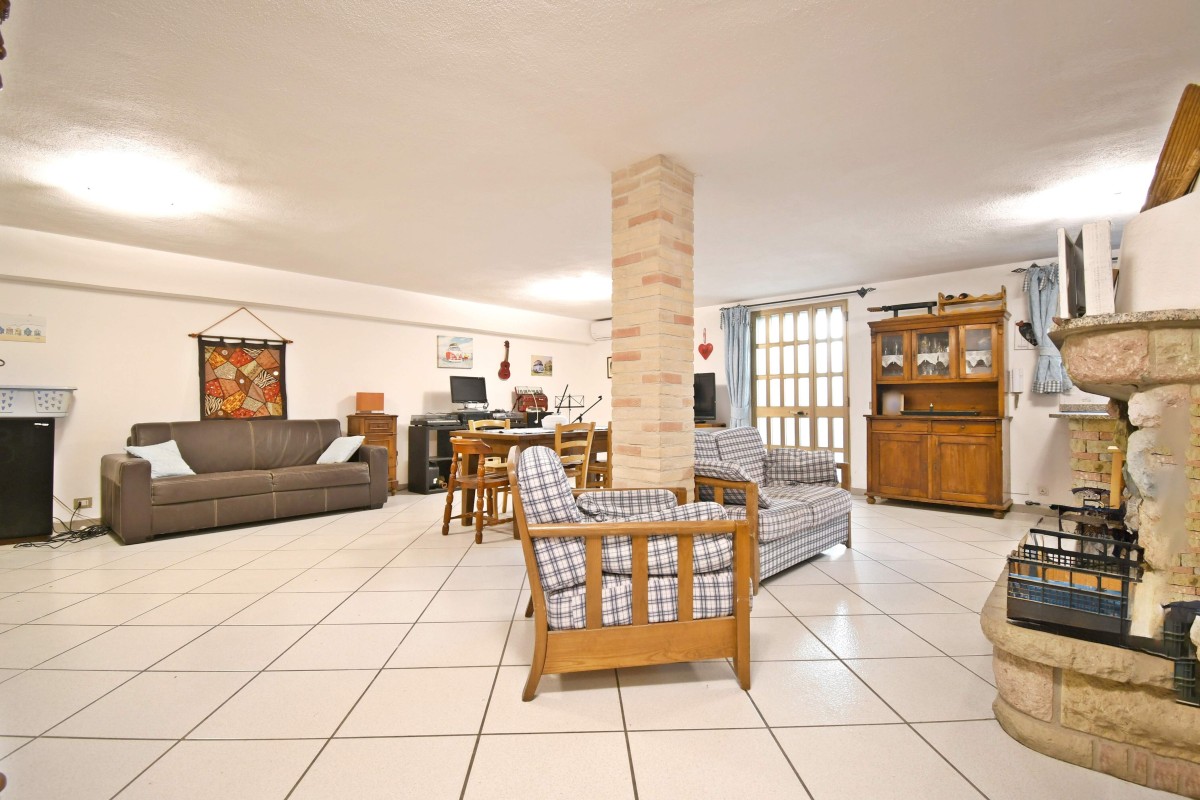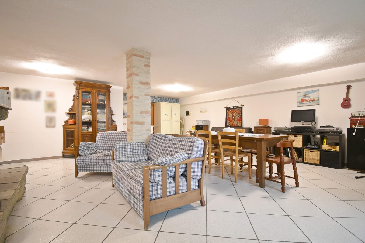 Scendendo al piano interrato troviamo un grande ambiente versatile, ideale come zona relax o taverna, impreziosito dalla presenza del caminetto che rende l’atmosfera calda e accogliente. Il piano è completato da una zona lavatoio e da due accessi indipendenti che conducono sia al cortile frontale che a quello posteriore, rendendo gli spazi ancora più funzionali.